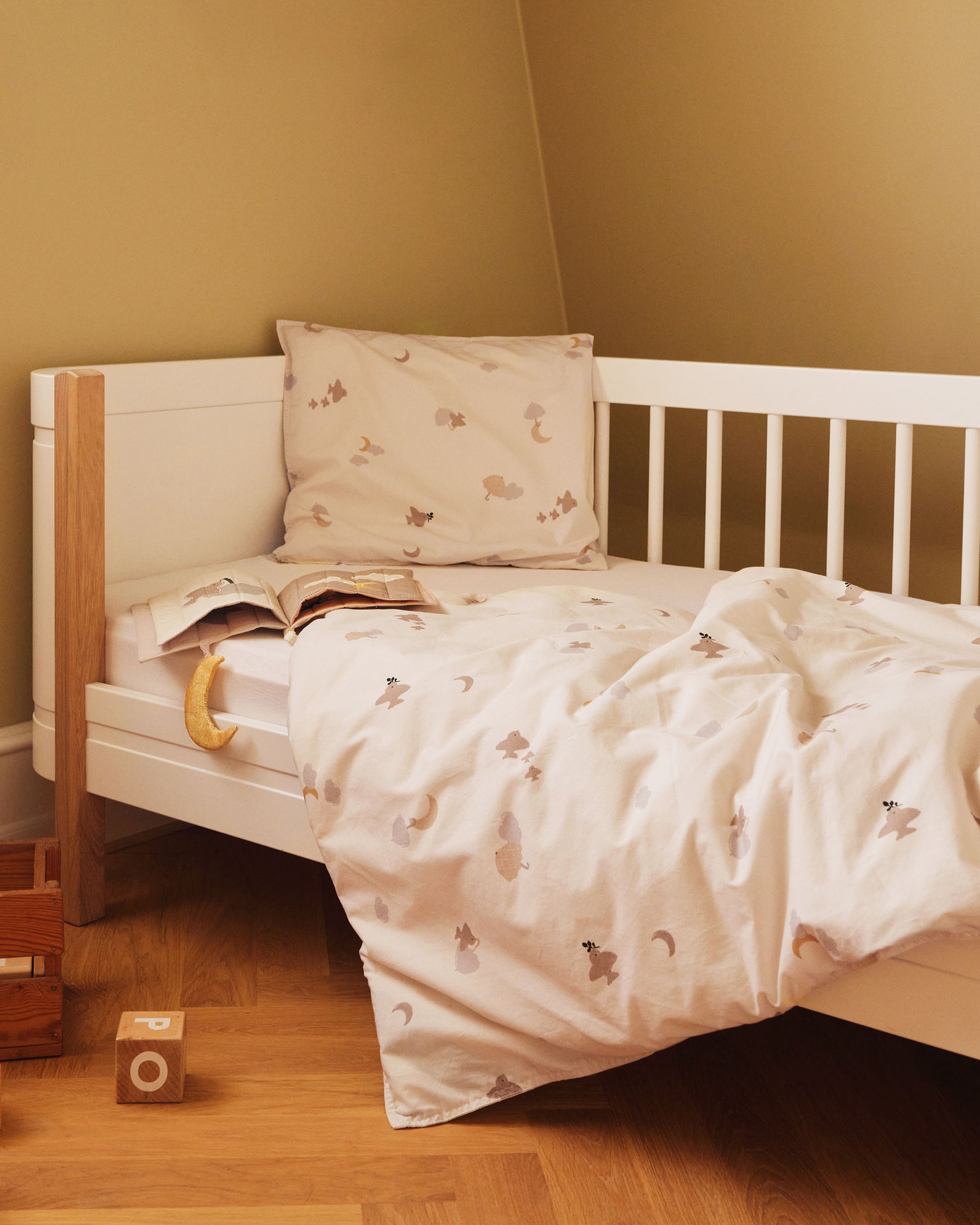 These soft bed linens invite your little one for cuddly moments and sleepy hours. Made from organic and natural materials in a timeless design for your baby's dreamiest sleep.